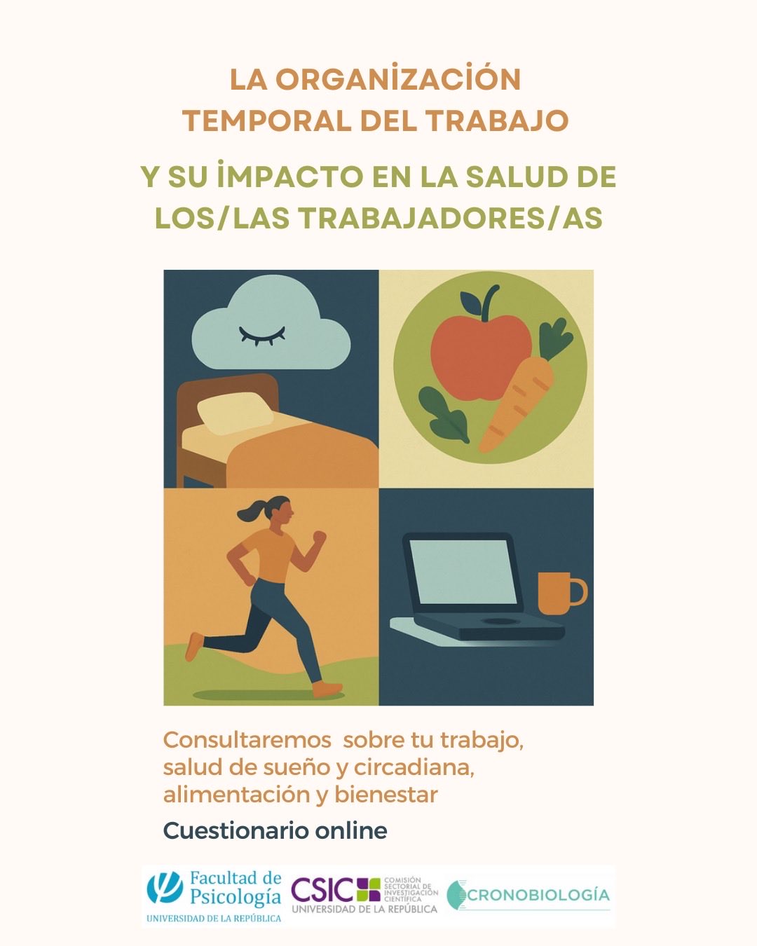 La participación consiste en completar un breve cuestionario anónimo en línea, que lleva aproximadamente 10 minutos, donde se consultará sobre su trabajo, su salud de sueño y circadiana, su alimentación y su bienestar: